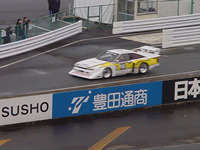 | (4) あいにくの天気で、あまりコース上へは行けませんでしたが、今回は星野和義氏の引退セレモニーとあって、多くの名車が疾走し又、今回・旧車のレーシングカーをレストアして、出場させることになりました。毎年、1台ずつ完成させているようですが、今年はチェリークーペX-1R。A型エンジンの横置きでFF車。これを知っている世代は少ないと思うけど、残念ながらイイショットが撮れませんでした。 | |||||||