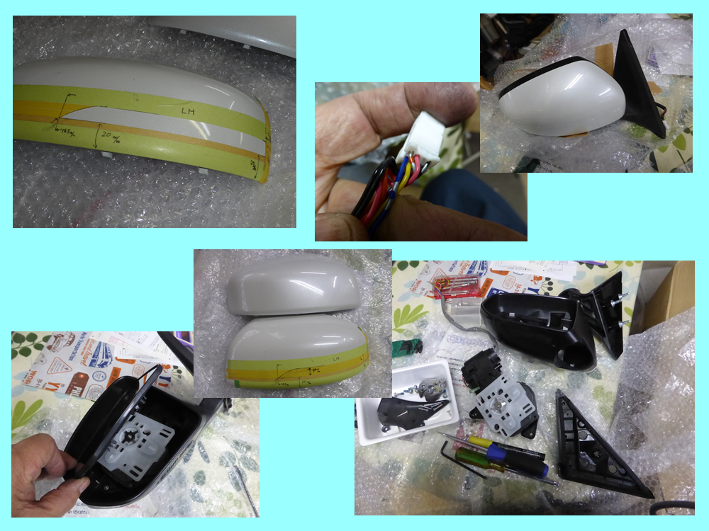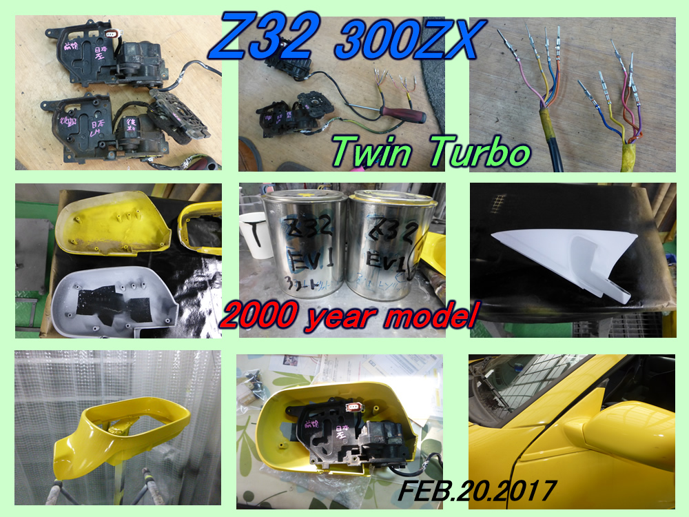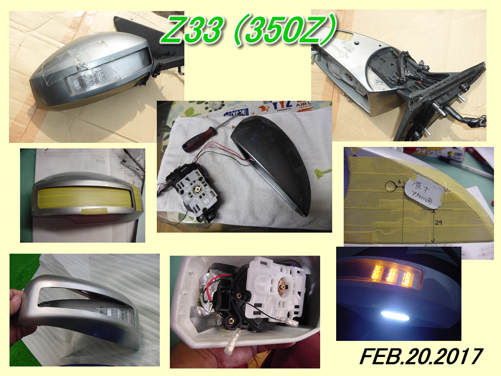 02月28日(火曜日) 1月から、3台の歴代Zのドアミラーを修理や、特注品の製作をいたし ましたので、紹介いたします。 ○ まずは、最終型のZ32のドアミラーの破損・交換です。 外観は同じようなドアミラーAssyですが、構造や配線で2種類に大別を いたします。 この最終型のミラーAssyは、1個定価で¥70.400(税別)でしたが、 もう現在は、製廃でした。 (やや驚きの価格!) 今回は、初期型のミラーAssy(中古)で対応することにいたしました。 ガラスのミラー部分は、構造が違うので互換性は無く、再使用は不可。 配線の接続カプラーも違いますが、端子や線色や固定は同じだったので ミラーAssyを分解・洗浄して色の塗り替えをいたしました。 ○ Z33は、当社オリジナルの"TypeA"LEDミラーの破損・交換でした。 ミラーカバーはオリジナルのまま、形状の似ていたラフェスタのオプション LEDウインカーを流用していました。 中古で十分に対応出来るので、中古ミラーAssyを分解・洗浄してから、 車体色のカバー部分を切開・加工いたします。 LEDウインカーは新品です、ガラスミラーも欧州仕様を採用しました。 ラフェスタのLEDオプションパーツが、まだ購入出来たのは驚きでした。 ○ 最後は、Z34の当社オリジナル商品のLEDミラーです。 公開をしていないので、これまでに6台ほどしか販売していません。 どちらでお尋ねになったのか不明ですが、12月に受注をしてから2ヶ月 以上もお待たせいたしました。 Z33以上にオリジナルカバー部分や、アルミフレームの加工が難しく、 LEDウインカーも、ベンツやアウディのパーツを購入して試作品を幾つか 作ってみました。 Z34は、スモールでの白色点灯が進化しています。 Z33のように海外 製品が市場に出て来ないので、どうも唯一になりそうです。 (北米仕様も電動収納機能を付けて、加工もしています。当社の370Z)