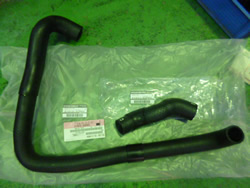 写真11 : 小ホースの交換時に使用する、固定バンドは再使用も可能 ですが、熱劣化しているので交換が推奨です。 アルミ製のパイプは、腐食が有ったので除去しましたが、凸凹 が生じているので、液体ガスケットを併用してください。 こうしたパーツ以外にも、推奨の付帯作業としては、タイベル・ カバーの裏側洗浄や、脱着したラジエターも高圧洗浄をいたし ます。 当然のことですが、省略する企業も多いとは思います。 ラジエターの新品交換も推奨事項です。