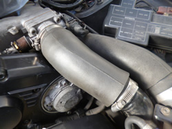 写真16 : その他にも、2回目となるとターボ車でしたが、エアーホース の裂けも有りました。 経年劣化による硬化で、柔軟性が失 なわれ、思わぬ事案も多々発生いたします。 分解・脱着のパーツが多いので、ついでに周辺の回転パーツ も、触感などで軽微な検査をいたします、プロですから。 エアコンのアイドル:プーリーも良く回転異音がいたします。 同じ、関連した周辺パーツなので、交換しました。