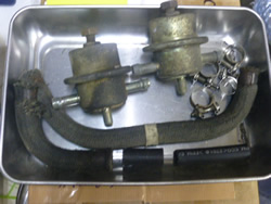 ■ S130 フェール・ダンパーAssy ■ 数十年まえに、製廃となっています。 パーツは、電磁ポンプから発生する、加圧脈流を一定に する役目を負っています。重要度は低いですが、 エンジン始動時や、高回転時の失火を押さえます。 周辺のホース2本も製廃になっていますので、 高圧用の燃料ホースをご用意ください。 (2025年12月記) ・・・ ¥72,000(税別) ・・・